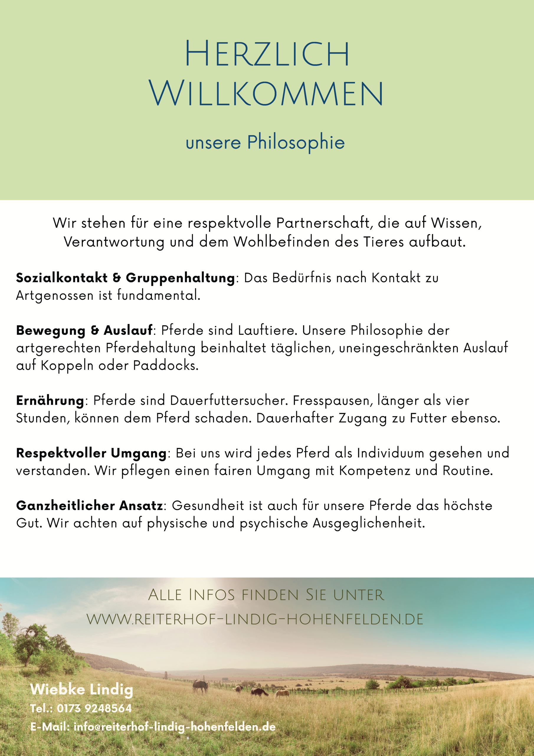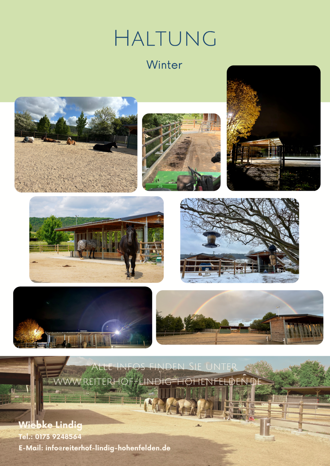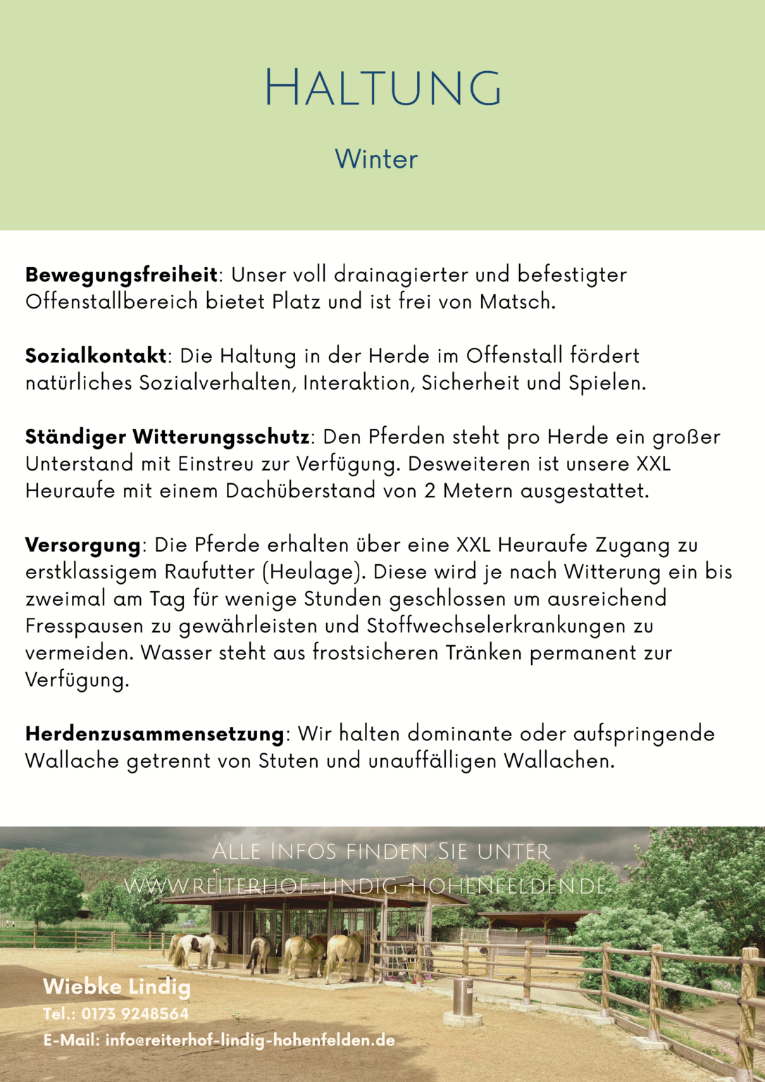 Wir legen besonders viel Wert auf qualitativ hochwertiges Raufutter und bauen dieses auf den hofzugehörigen Flächen an. Ebenso viel Wert legen wir auf ein gutes Gesundheitsmanagement und einen fairen Umgang mit den Pferden. Im Krankheitsfall suchen wir Alternativen zur sonstigen Haltungsform auf unserem Hof und gestalten diese individuell (Mehrkosten entsprechend Aufwand).