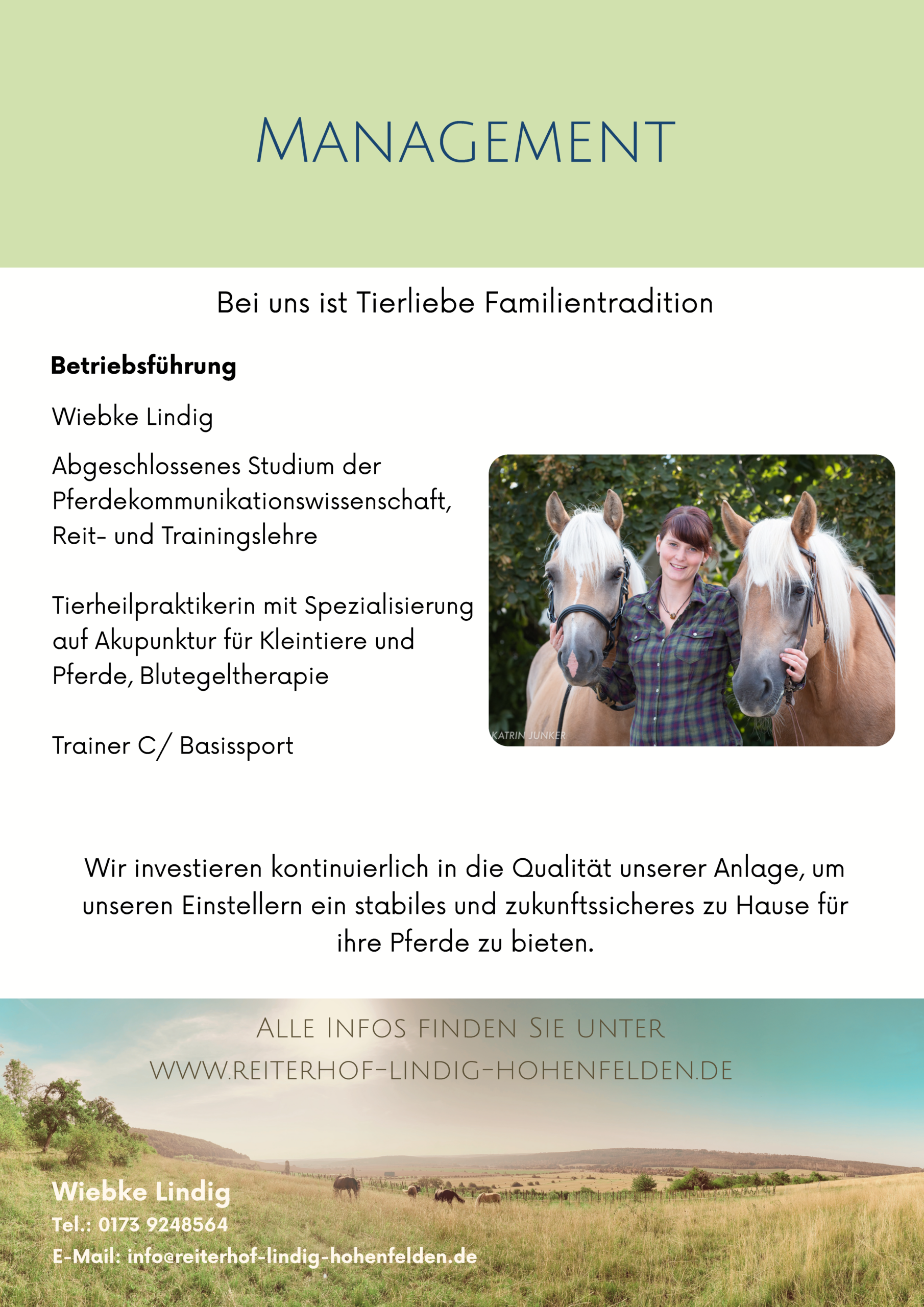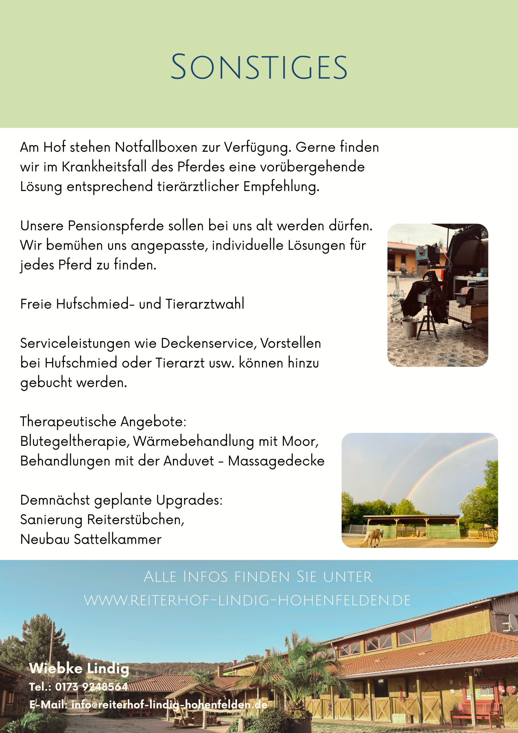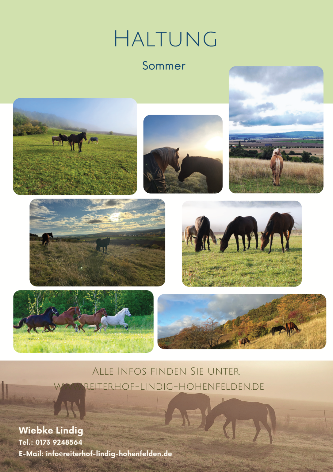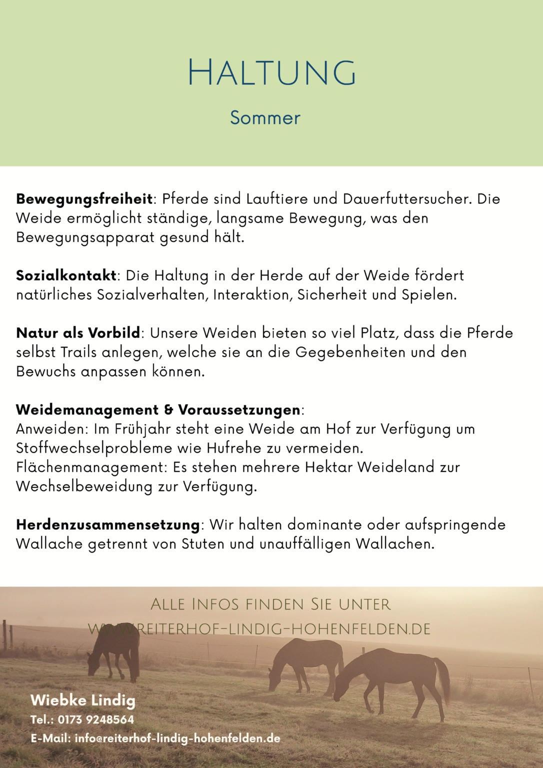 Wir legen besonders viel Wert auf qualitativ hochwertiges Raufutter und bauen dieses auf den hofzugehörigen Flächen an. Ebenso viel Wert legen wir auf ein gutes Gesundheitsmanagement und einen fairen Umgang mit den Pferden. Im Krankheitsfall suchen wir Alternativen zur sonstigen Haltungsform auf unserem Hof und gestalten diese individuell (Mehrkosten entsprechend Aufwand).