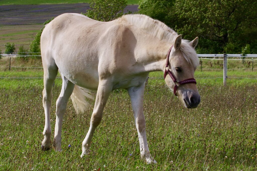 Schneewittchen wurde 2021 geboren und ist seit Sommer 2024 bei uns. Sie befindet sich derzeit in Ausbildung und wird schonend angeritten.